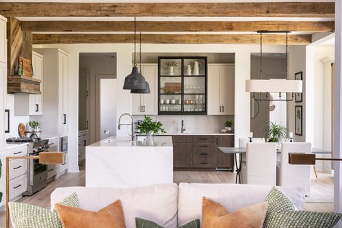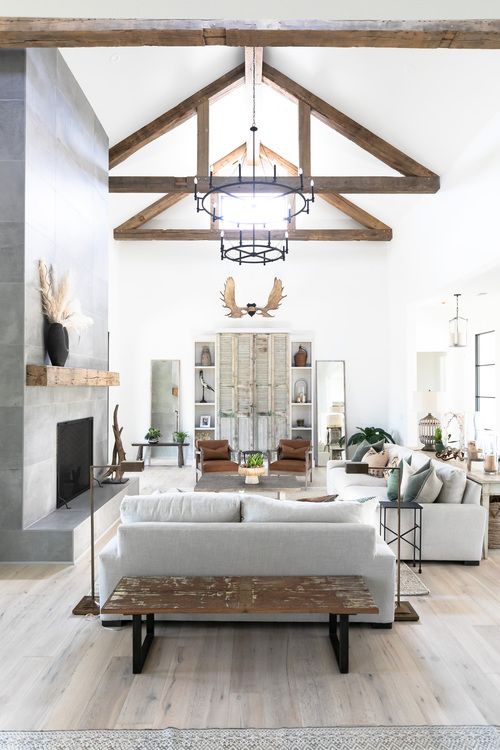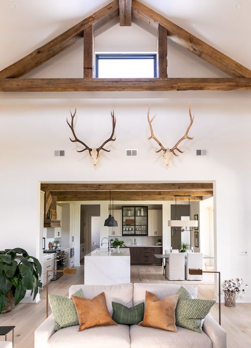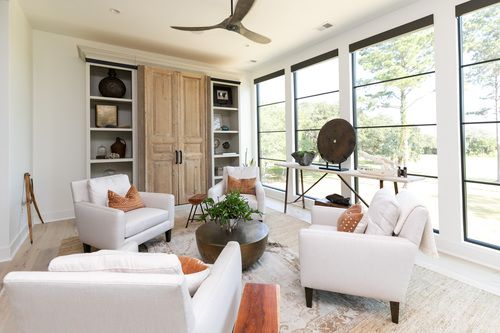 Nestled on 30 acres in Awendaw, with distant views of Seewee Bay, this custom built home was a joint collaboration over two years with Max Crosby Construction and decorating assistance from Meredith Rietz. All the finishes, fixtures, furniture and accessories were selected by WRD to create a warm and cozy home with clean lines and a neutral palette. Most of the antiques throughout the home were purchased while antiquing in Texas. Those pieces include vintage shutters used as doors on TV cabinets, an aged zinc kitchen table, aged mirrors and armoires, and a lavender drying table from Provence. The animal hides and antlers were selected while shopping in the mountains of North Carolina and the beams by Encore Lumber were specified from old barns in the Southeast. Modern elements are noticeably mixed in to the space such as illuminated mirrors, steel windows and exterior doors, a tall concrete tile fireplace and waterfall kitchen countertop. All photos are by Leslie McKellar.